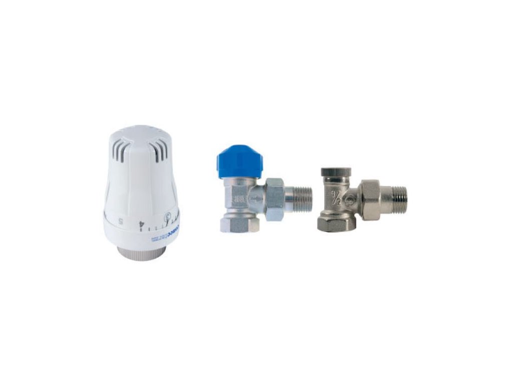 Termostatická hlavice VK 2 s kapalinovým čidlem. Termostatický radiátorový ventil 1/2" s přednastavením. Uzavíratelné radiátorové šroubení 1/2".