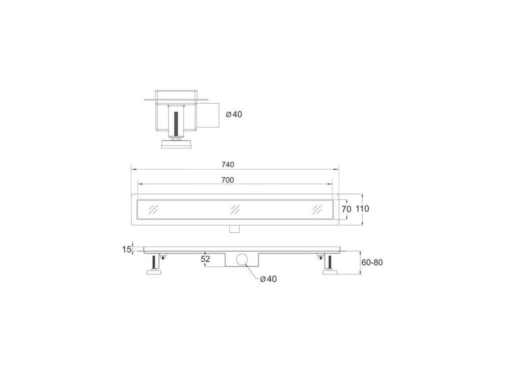 Odtokový žlab je dodáván včetně roštu TILE. Rošt je možné použít jako variantu, kdy je vidět jednolitá nerezová plocha, nebo je možné do roštu nalepit přímo dlažbu.