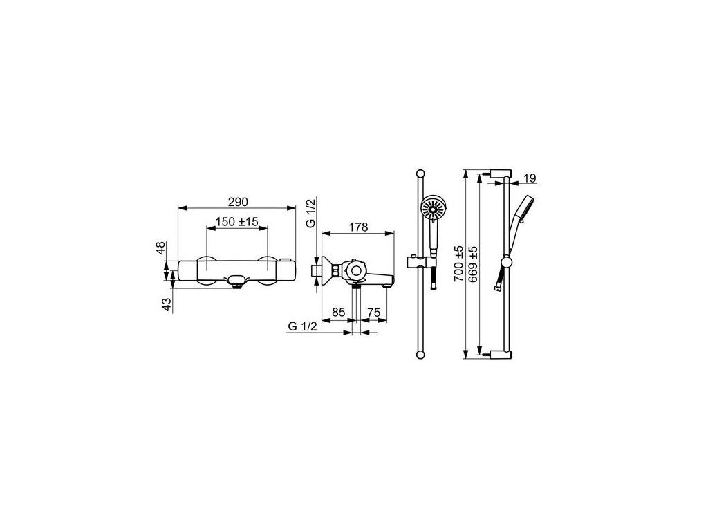 - Díly sprch: Ruční sprcha, Sprchová tyč, Sprchová hadice (1500 mm), Eco funkce pro omezení průtoku vody