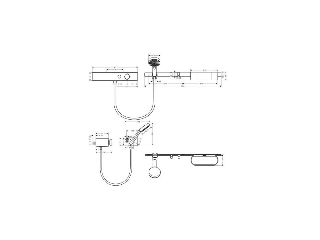 - obsahuje: ruční sprcha, sprchový termostat, sprchová hadice, nástěnná tyč, polička, jednoduchý háček, držák ruční sprchy
