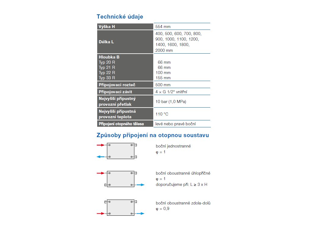 Umožňuje levé nebo pravé boční připojení na rozvod otopné soustavy a konstrukcí je určeno pro otopné soustavy s nuceným nebo samotížným oběhem. Ze zadní strany jsou přivařeny dvě horní a dolní příchytky, otopná tělesa o délce 1800 mm a delší mají navařena šest příchytek. Široký typový sortiment RADIK KLASIK - R umožňuje vždy vybrat tu nejvhodnější adekvátní délku.
